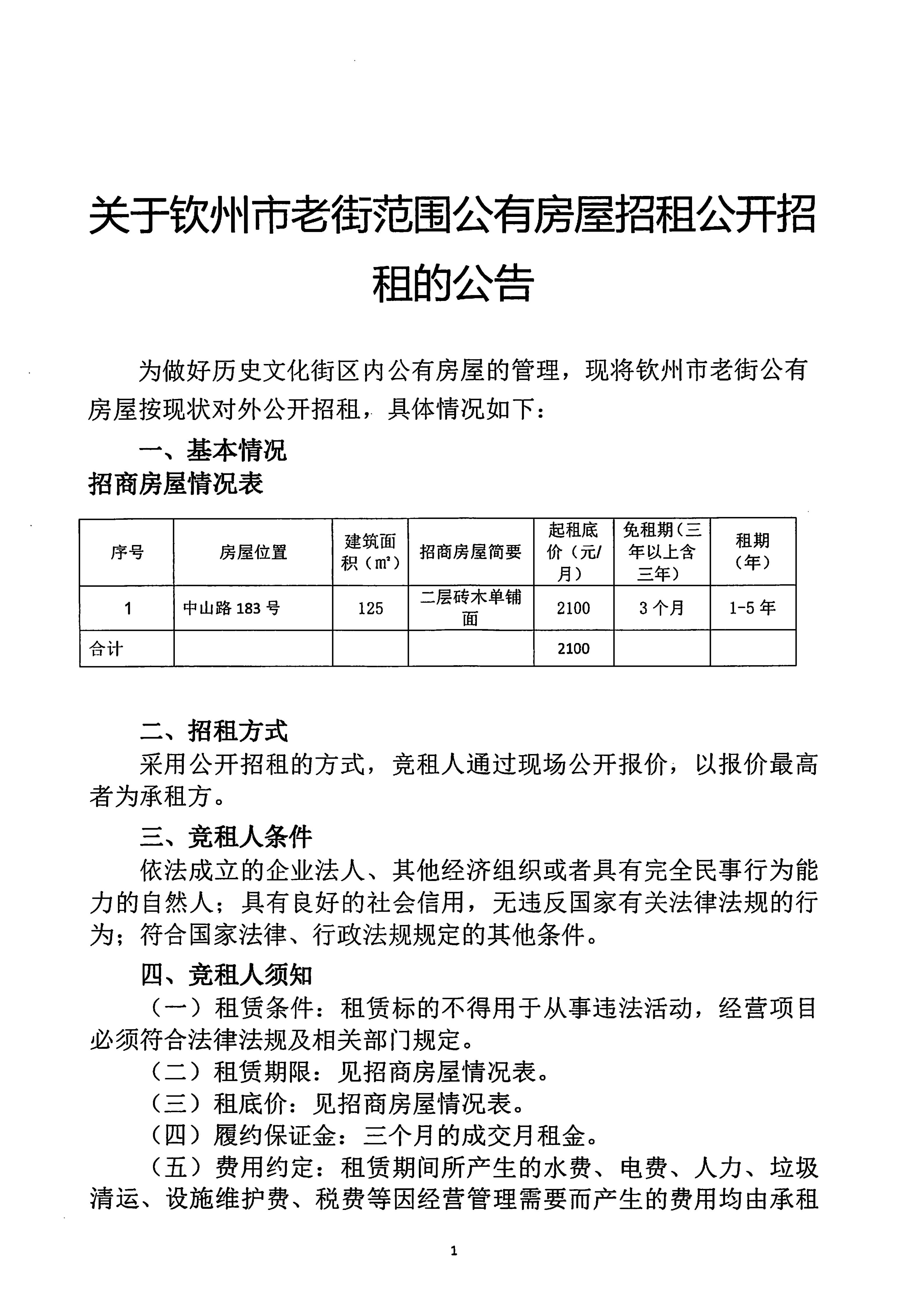 關(guān)于欽州市老街范圍公有房屋招租公開招租的公告(中山路183號)